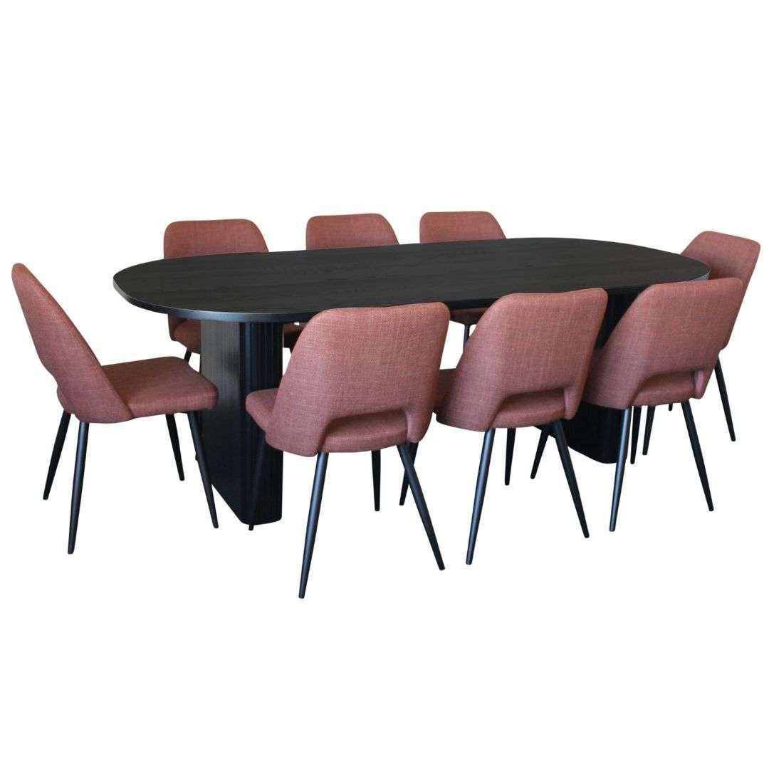 The Melba 9 Piece Dining Set in sleek black with Zara Chairs in luxurious Russet fabric is a stunning addition to any dining room. This set is perfect for entertaining guests or enjoying family meals in style. The table features a modern design with clean lines and a spacious surface for comfortable dining.