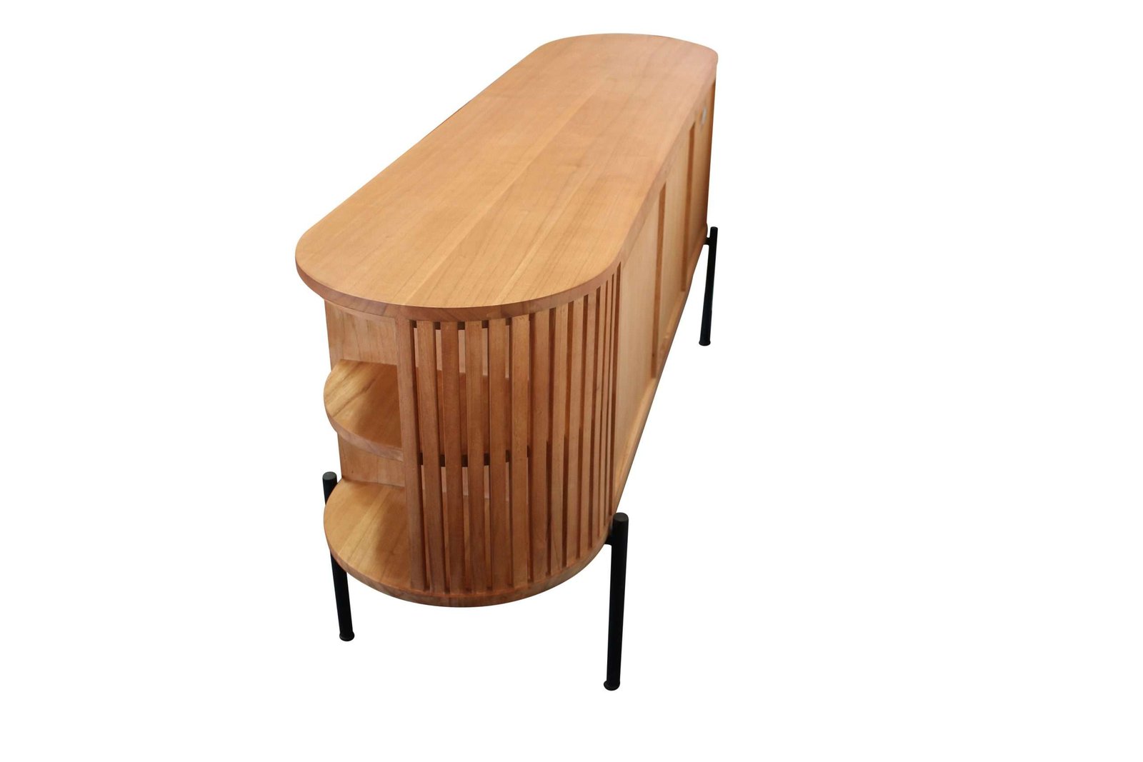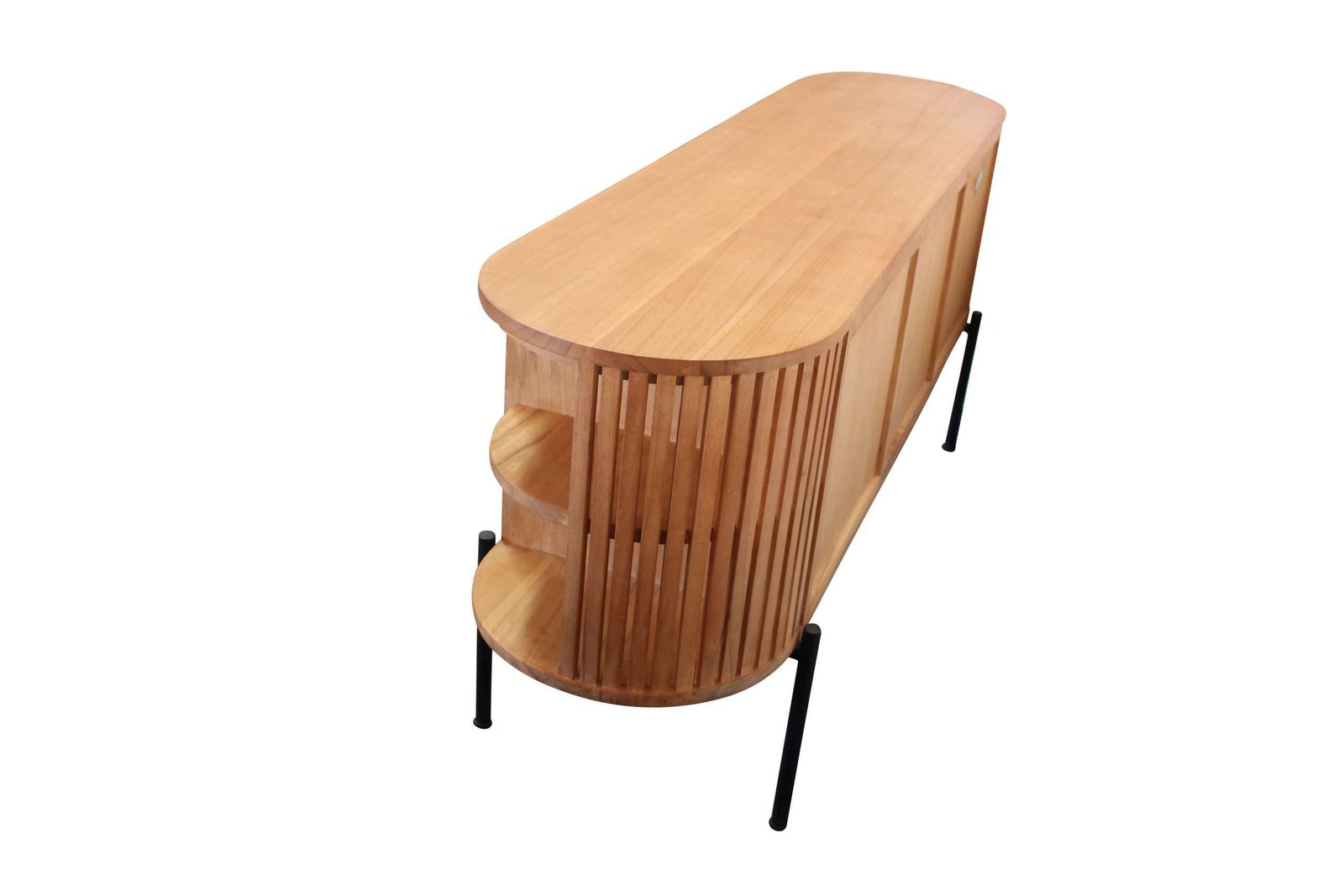 The Otis 2 Door 2 Drawer Buffet with rattan insert is a stylish and functional addition to any dining or living space. Crafted from oak, this buffet boasts a sleek design with external rounded shelves and ribbing details, adding a touch of sophistication to your decor. The black steel base provides stability and a modern touch to the overall look.