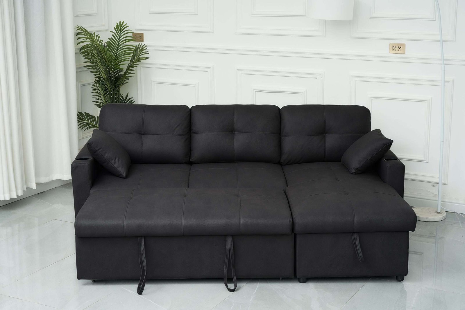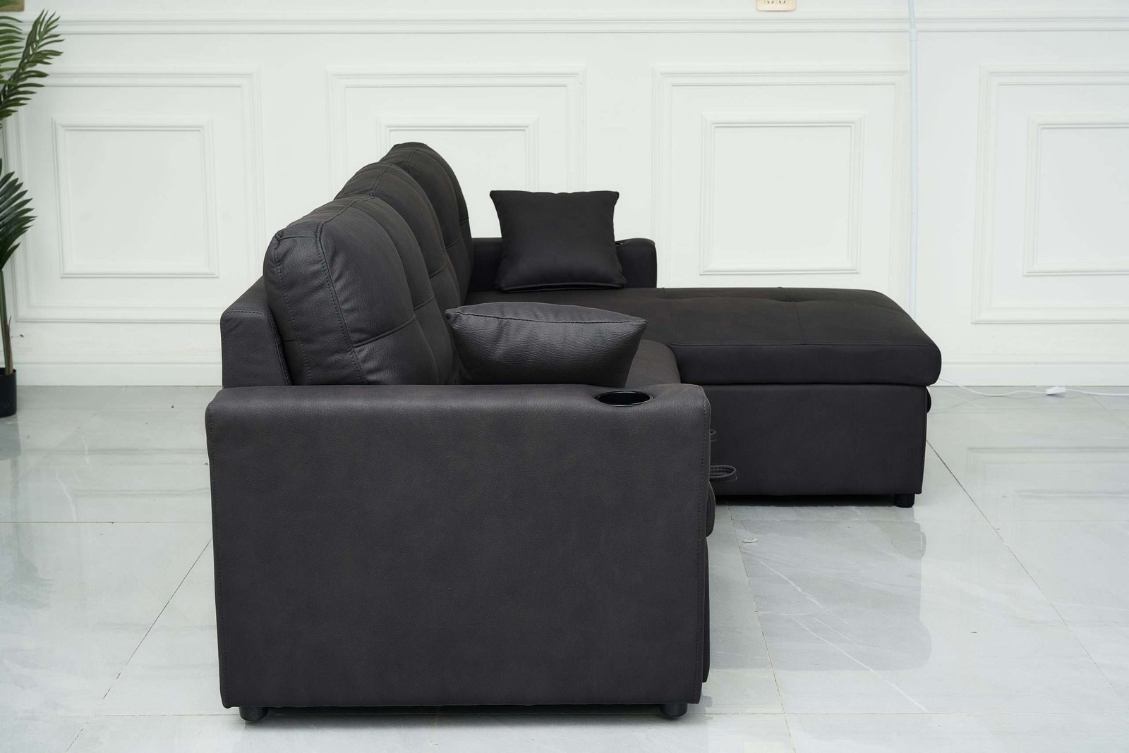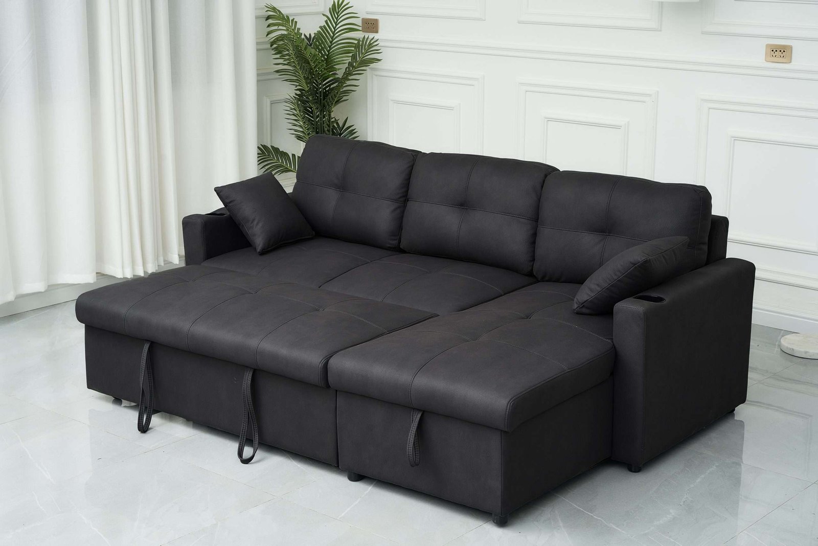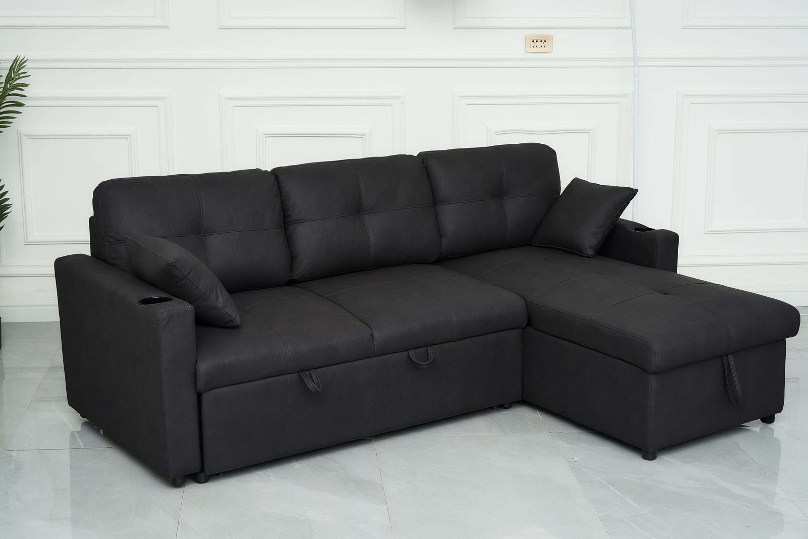 Introducing the stylish and functional Romy Sofa Bed with storage chaise in sleek black. This versatile piece of furniture is perfect for modern Australian homes, offering both comfort and convenience. The innovative Technology fabric not only adds a touch of luxury but also ensures durability and easy maintenance, making it ideal for everyday use.